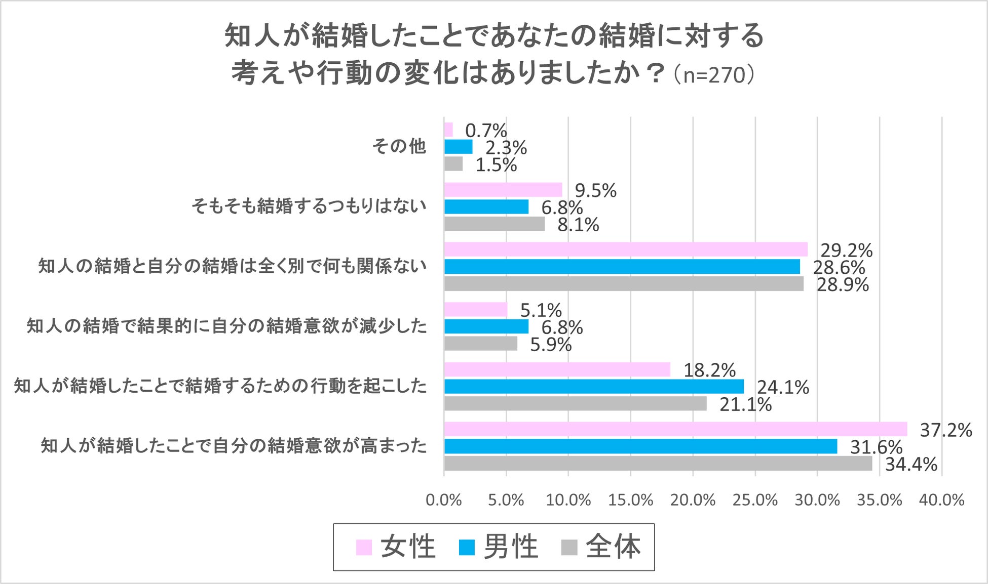 知人の結婚をきっかけに周囲から自身の結婚について聞かれたりすることが、結果的に結婚への興味を削いでしまうということと、先を越された感により気分的に落ち着かない状況となることで、結婚そのものへの意識が薄らいてしまう人が少数ではありますがいることがこの設問から読み取ることができます。