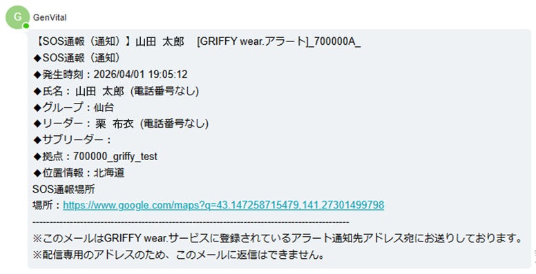「direct」の通知メッセージでは、発生時刻・着用者氏名・着用者の位置情報などを確認できます。