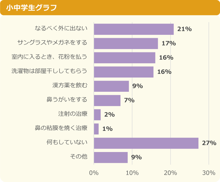 その他には「マスクを外さない」「家に帰ったら顔を洗う」「花粉防止スプレーをかける」など自分でできる対策をしている人や、病院へ通っている人の中にはアレルギーの治療法である「鼻の粘膜を焼く治療(レーザー治療)」や「舌下免疫療法」などの対策している人もいるようです。