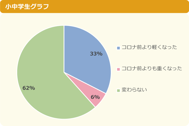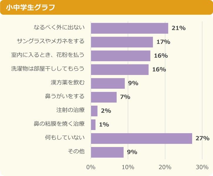 花粉症のせいで一番苦しんでいることは、「勉強に集中できない」と回答した小中学生が最多でした。また、新型コロナウイルス(以下、コロナ)の影響による日常的なマスク着用での花粉症の症状の変化を聞いた質問では、「変わらない」が約6割でしたが、33%が「コロナ前より軽くなった」と回答しました。今までに効果があった花粉症対策グッズは、新型コロナウイルスの影響で日常的に使うことが増えたマスク以外にもさまざまなグッズが集まり、「花粉防止スプレー」や「ワセリンを鼻にぬる」など、見た目では分かりにくいアイテムを使い症状をやわらげる努力をしている人もいるようです。