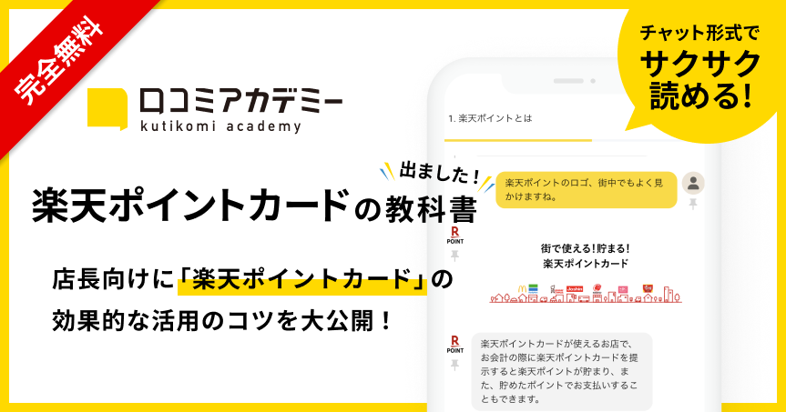 今回「口コミアカデミー」で公開した「楽天ポイントカードの教科書」では、楽天ペイメント公式監修の元コンテンツを製作。「楽天ポイントカード」の特徴や、集客に効果的な使い方についてわかりやすく解説します。
