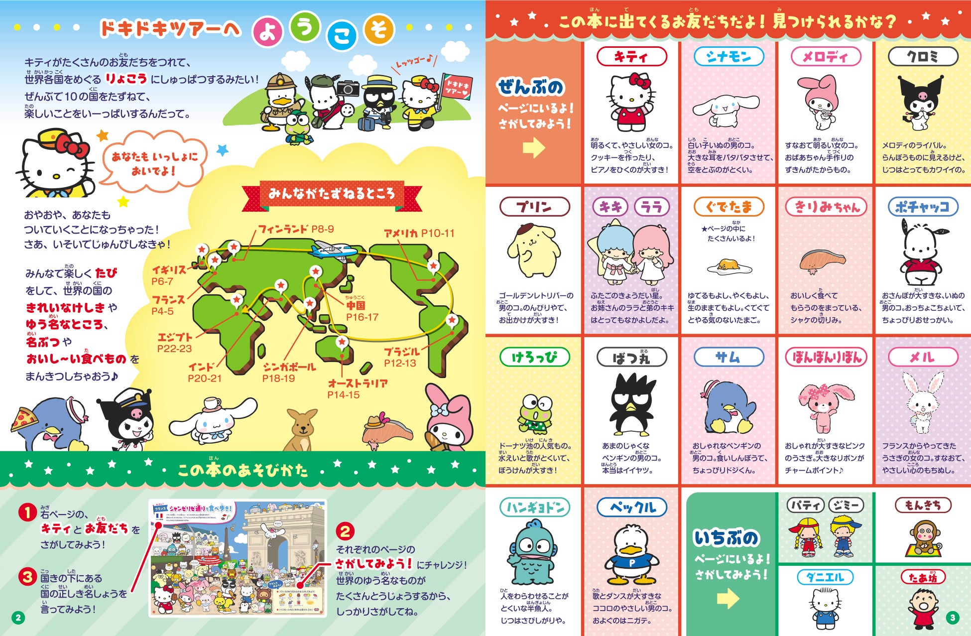 本書は2018年発行の『るるぶ 学べるさがし絵えほん みつけて! サンリオキャラクターズ みんなでドキドキ日本一周旅行』の第2弾として、ハローキティやシナモロールをはじめとする、株式会社サンリオの人気キャラクターたちが世界一周旅行をするさがし絵えほんです。