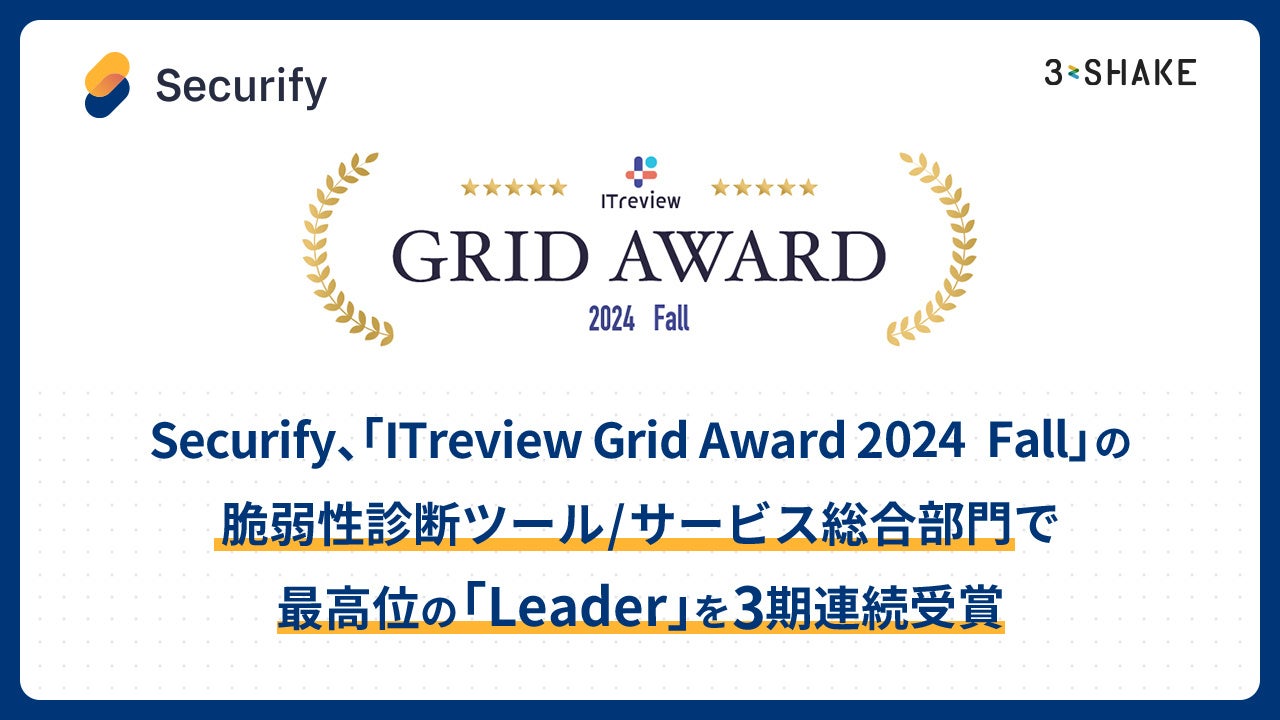 株式会社スリーシェイク(本社:東京都新宿区、代表取締役社長:吉田 拓真、以下スリーシェイク)が提供する、セキュリティツール「 Securify(セキュリファイ)」は、IT製品レビュープラットフォーム 「ITreview(アイティレビュー)」 において顧客満足度・製品認知度ともに優れた製品であると評価され、 「ITreview Grid Award 2024 Fall」 の脆弱性診断ツール/サービス総合部門、中堅企業部門の2部門において最高位の 「Leader」 を受賞したことをお知らせします。なお、今秋の受賞で、脆弱性診断ツール/サービス総合部門ではLeaderを3期連続、中堅企業部門ではLeaderを2期連続受賞となります。