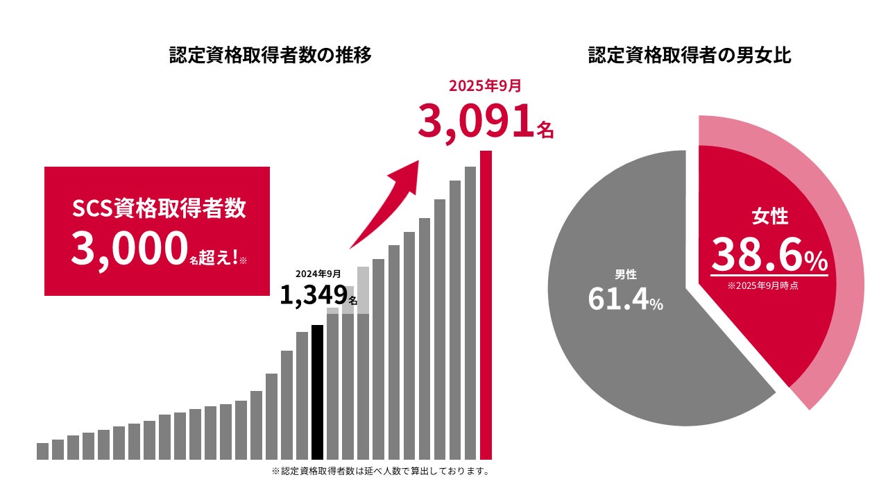 SCSは制度開始以来着実に認定者を増やし、2024年9月には1,300名を突破。 その後わずか1年で3,000名を超えるまでに拡大しました。 取得者のうち女性の比率は約39%と、IPAの情報処理技術者試験の女性比率(2011年時点13%(※4))の約3倍にあたります。 IT分野において女性の参画が課題とされる中、女性比率の高い資格として注目されています。