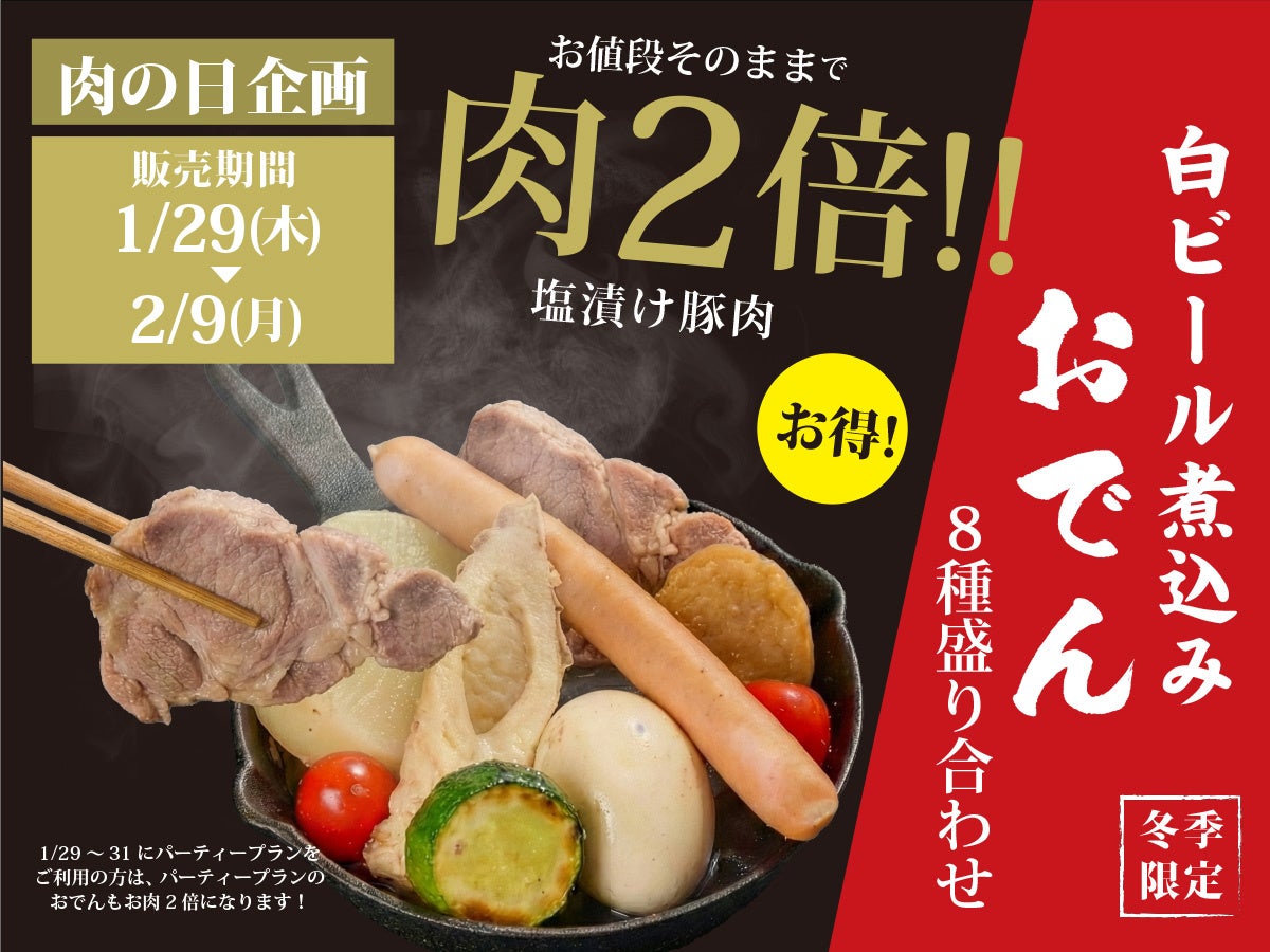 2026年1月31日(土)まで実施中の冬のパーティープランで提供する白ビール煮込みおでんも、1月29日(木)・30日(金)・31日(土)の3日間限定で“肉2倍”になります。
