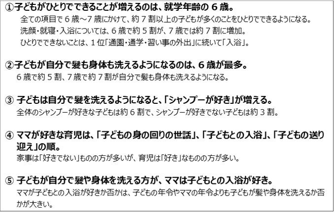 4月は、子どもの入園や入学に伴い家庭で行うことが大きく変わりますが、働くママにとっては、育休からの仕事復帰や仕事の組織変更などの環境が変わり、忙しい時期であるとも言えます。今回の調査では、子どもが身の回りのことを自分でできるようになることで、特に家の中で子どもがひとりでできることとして最も難易度が高いのが「ひとりでの入浴」であることがわかり、それができるようになるためには、ひとりで髪・身体を洗えるようになることが重要だとわかりました。以前の調査で、パパよりもママの方が子どもとの入浴が好きでないということがわかっており、ママの入浴時の負担がその一因でもあるのではないかと想像できますが、ママは、「子どもの身の回りの世話」、「子どもとの入浴」、「子どもの送り迎え」などの育児は約半数が好きだと答えており、相対的に家事よりも育児が好きだという傾向があり、育児を楽しんでいるママも多いことがわかりました。また、子どもは、自分で洗えるようになるほど、シャンプーが好きだと答える割合が高いことが示すように、入浴だけに限らず、人は自分でできるようになることが「好き」の第一歩であるのではないかと思えた調査でした。ひとりでの入浴は子どもの自立の証しでもあります。子どもが自分で髪を洗いたくなるように、「目にしみない」など安全性の高いシャンプーを選ぶ、中味を出しやすい容器であるものを選ぶ、髪も身体もかんたんに一緒に洗えるものを選ぶといった子どもの成長に合わせた洗浄料で、子どもが前向きに髪や身体を洗いたいと思う環境づくりも大事ではないでしょうか。また、子ども自身が好きな香りなど、好きなシャンプーを選ばせるなどの工夫をしてみることも、子どもが自分自身で洗いたいと思えるきっかけになるかもしれません。