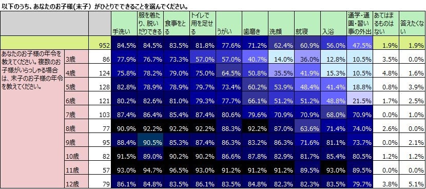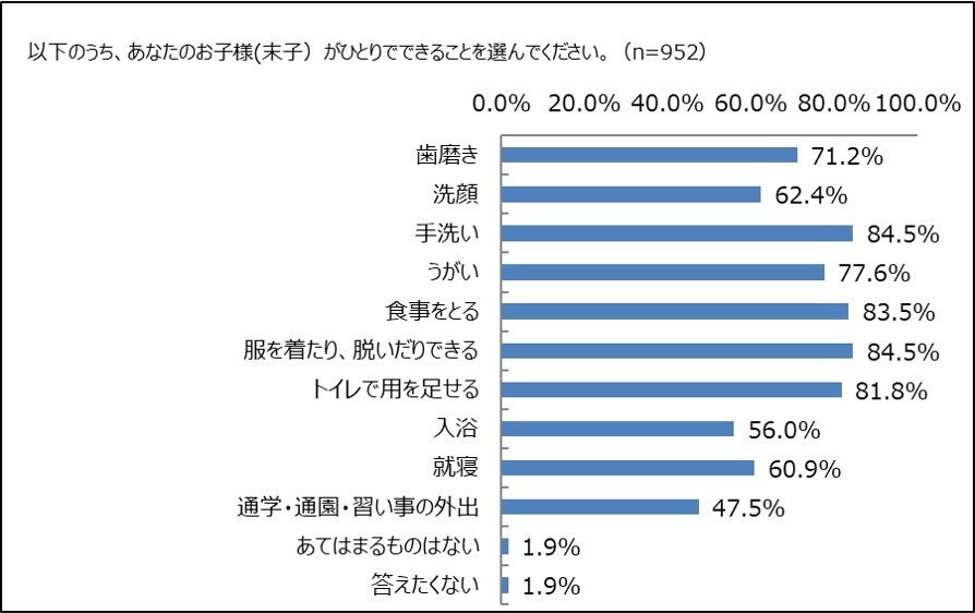 全国の25歳~44歳の3歳~12歳以下の子どもを持つ女性952名に、自身の子どもの身の回りことや、自身の家事育児について聞きました。子どもが複数いる場合は、末子について答えてもらいました。まず、身の回りのことについて、自身のこどもがひとりでできることを選んでもらいました。