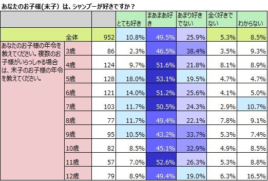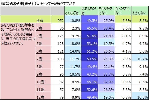 これを子どもの年令で見てみると、好きでないのは、3歳児が最も多く、年齢が上がると少し「好き」が増えますが、9歳以降で再度好きでない子どもの割合が増えるため、シャンプーが好きか否かは、年齢だけではないようです。
