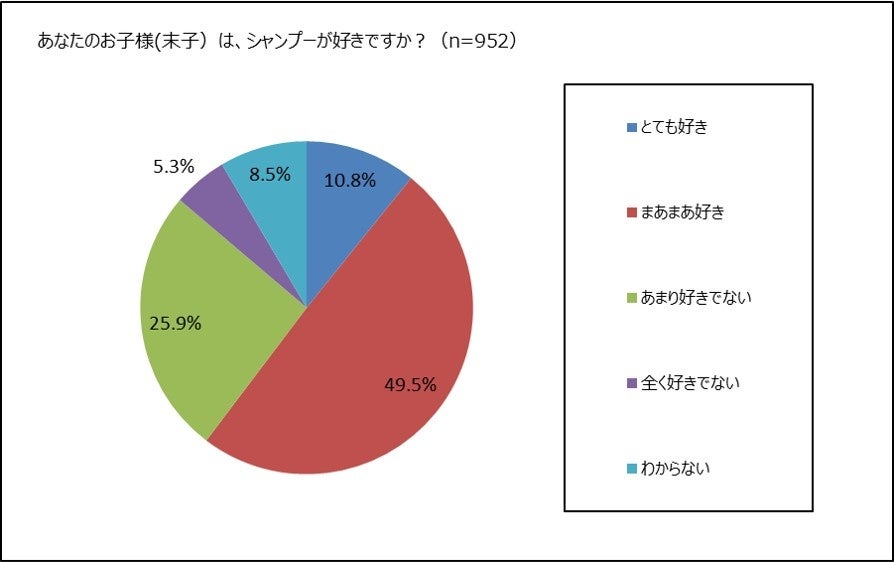 当社には、子どもはシャンプーが目にしみるので苦手だという声が寄せられるため、子どもがシャンプーが好きか否かを聞きました。全体では、「とても好き」10.8%と「まあまあ好き」49.5%を合わせた60.3%の約6割が好きだと答えており、「あまり好きではない」25.9%と、「全く好きではない」5.3%を合わせた31.2%の3割超が好きでないと答えています。