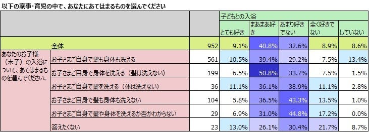 シャンプーが好きか否かを別の視点で確かめるため、子どもがシャンプーが好きかという質問と、子どもが自分自身で髪や身体を洗えるかの質問をかけ合わせて見てみました。この分析からは明らかな結果が見受けられ、自分自身で髪も身体も洗える子どもは、「とても好き」と答えている割合が74.8%と高く、髪も身体も自分自身で洗えないと答えた子どもは、「全く好きでない」と答えた割合が22.0%と最も高く、自分自身で髪を洗えるか否かが、子どものシャンプー好きと比例していることがはっきりとわかりました。