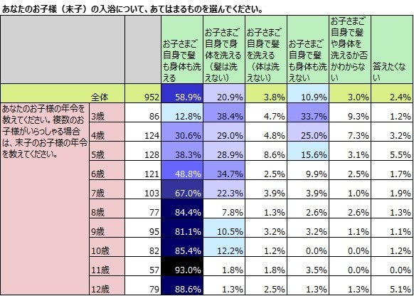 子どもがひとりで入浴できるか否かは、自分で髪や身体を洗えるか否かが大きく関係すると思い、子どもが髪や身体を子ども自身で洗えるか否かを聞きました。子どものひとりでの入浴と自分自身で髪や身体を洗えるかの割合はぴったりとリンクし、6歳で48.8%と約5割で7歳になると67.0%と約7割です。多くの子どもが先に身体のみ洗えるようになり、その後、髪を洗えるようになるようで、子どもにとっては身体よりも髪の方が自分で洗うことが難しいようです。9割を超えてほとんどの子どもが髪も身体も洗えるようになるのは、10~11歳であることがわかりました。