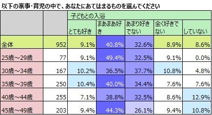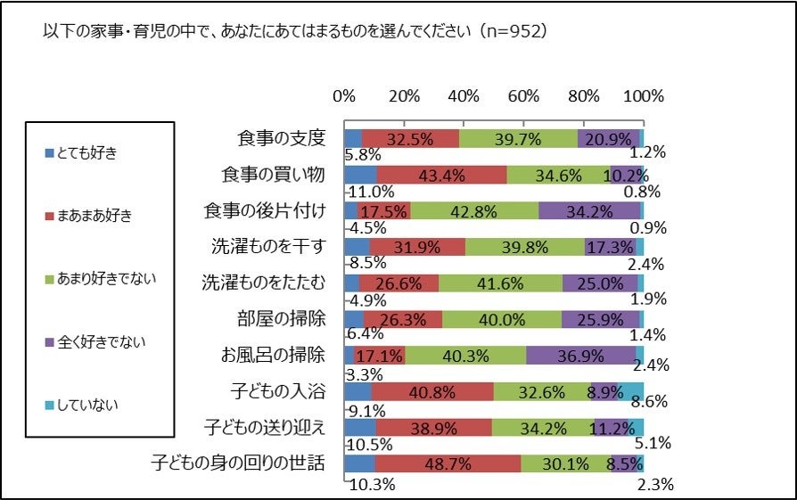 逆に、好きでない家事・育児は、1位が「お風呂の掃除」で、2位が「食事の後片付け」でした。育児や家事は大変であることと同時に好きであると答えている女性も多くいることがわかり、家事は、食事の買い物以外は、「好きでない」と答えた割合が「好き」よりも多かったのですが、育児はすべてで「好きでない」人よりも「好き」と答えた人が多い結果となりました。