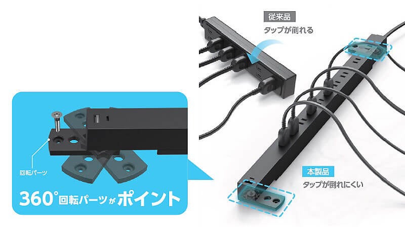 本体両端に回転式の脚パーツを装備しており、床などに設置しても倒れにくく、差込口を上にした状態で安定して設置できます。また、脚パーツに装備された「吊り穴」を使ってフックに吊り下げたり、「ネジ固定穴」を使って壁面などに固定することが可能です 。ACコンセントの一部は、差込口のピッチを広げることで、大型のACアダプターでも隣のコンセントに干渉しにくい構造になっています。
