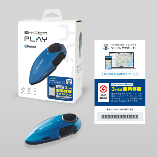 また、2023年4月21日(金)より、株式会社サイン・ハウスのバイク用 Bluetooth インカム『B+COM PLAY ( ビーコム プレイ )』と連携し、『B+COM PLAY』を購入されたお客様に、『ツーリングサポーター』のプレミアムコースを3ヶ月無料でご利用いただけるチケットをプレゼントする、「B+COM PLAY 限定 ナビゲーションアプリコラボレーションパッケージ」を、数量限定で発売します。