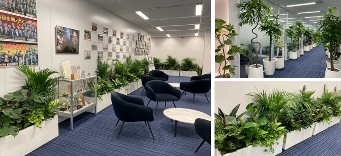 今年1月の本社移転に伴い、徐々に観葉植物を増やしていき先日98鉢を追加し、現在は200鉢を超える量となっています。観葉植物は、空気清浄や森林浴効果、視覚疲労緩和、心身のリラックスなどが期待できるとされており、オフィスの雰囲気の改善や社員のモチベーション向上につながっています。ご来社いただいた皆様がご利用になる待合いスペースや各応接室にも観葉植物を設置をしています。