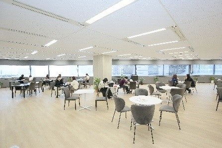 従業員向け休憩スペースは床の色を変え、景観もよく暖かみのある空間で、心も体もリラックスできるようになっています。お昼休憩に利用する従業員が多く、電子レンジなどの家電も充実しています。マッサージチェアも7台置いてあり、自由に利用できリフレッシュできる空間となっており、従業員の労働環境に配慮したスペースになっています。