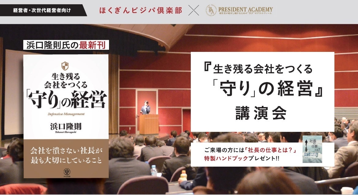 2022年度の塾生募集にあたり、プレセミナーとして『生き残る会社をつくる「守り」の経営』講演会(講師:株式会社ビジネスバンクグループ代表取締役 浜口 隆則氏)を下記のとおり開催いたします。