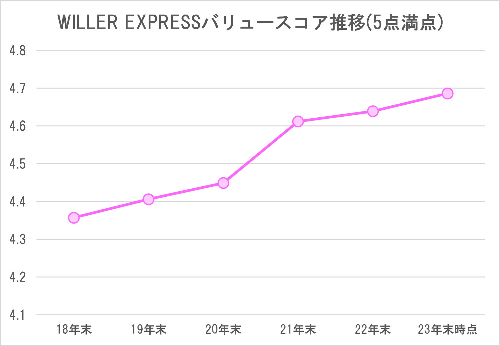 弊社では、お客様目線でのサービス改善を重ね、収益の向上を図ってまいりました。昨年導入した高速バスシートの「Prime(プライム)」「DOME(ドーム」」は、その一例です。また、ハイウェイパイロットの接客接遇スキル向上にも重点を置き、お客様の満足度を高めています。弊社のお客様からの評価指標である「バリュースコア」(※)は、2023年末には5点満点中平均4.686点まで上昇し、顕著な改善が実証されています。
