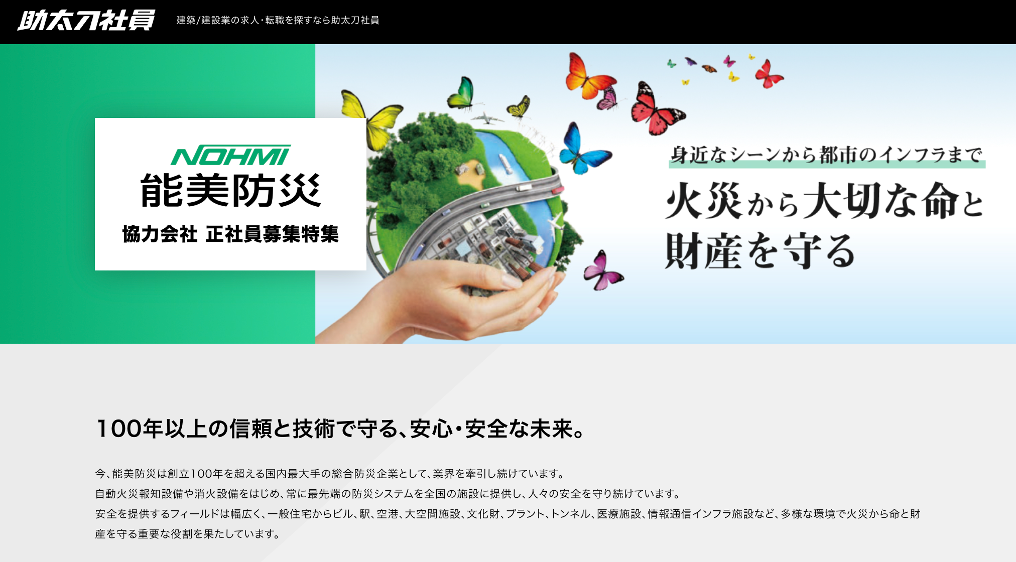 「助太刀社員」トップページに、「能美防災 協力会社求人特集ページ」を掲載いたします。また、協力会社の求人票には能美防災のロゴをバッジとして表示することで、同社のブランド力を活用し、協力会社への応募・採用成功を目指します。