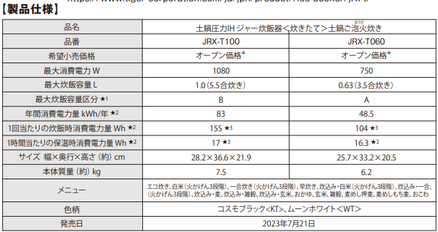 製品URL> https://www.tiger-corporation.com/ja/jpn/product/rice-cooker/jrx-g/