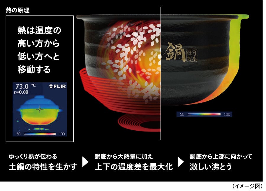 「300℃ WレイヤーIH」は、底面に2層IHコイル構造を採用。なべ底部分を包み込む発熱コ イルの1層目は、釜全体に熱をシームレスに伝えます。また、2層構造にすることで、大火 力および、土鍋を直火で炊くような炎の温度差を再現。ゆっくり熱が伝わる土鍋の特性を 利用して、上下の温度差を活かした激しくもやさしい熱対流で、ごはんの甘みを最大限に 引き出して一気に炊きあげます。