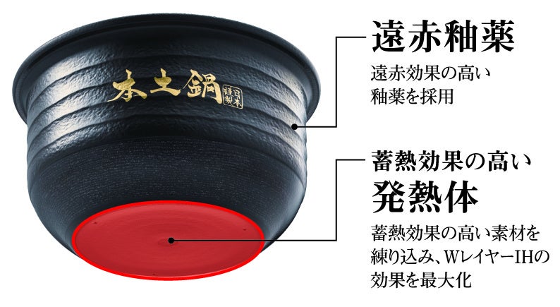 「土鍋」"遠赤釉薬”と”火山炭を練り込んだIH発熱体”により、300℃ WレイヤーIH※1のポテンシャルをさらに高める。