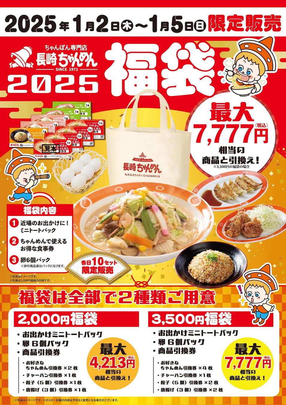 本年も残り少なくなりました。今年一年のご愛顧に「長崎ちゃんめん」スタッフ一同感謝を申し上げます。そして2025年は新春キャンペーンよりスタートいたします。1月2日(木)より1月5日(日)まで各日 2種類の「福袋」を各10セット(合計20セット)販売いたします。内容は卵6個パックに特製ミニトートバッグ、そしてちゃんめん・チャーハン・餃子・唐揚げ、それぞれの引換券でございます。早い者勝ちで「1グループに1つの福袋」とさせていただきます。新春より皆さまのご来店をスタッフ一同お待ちしております。