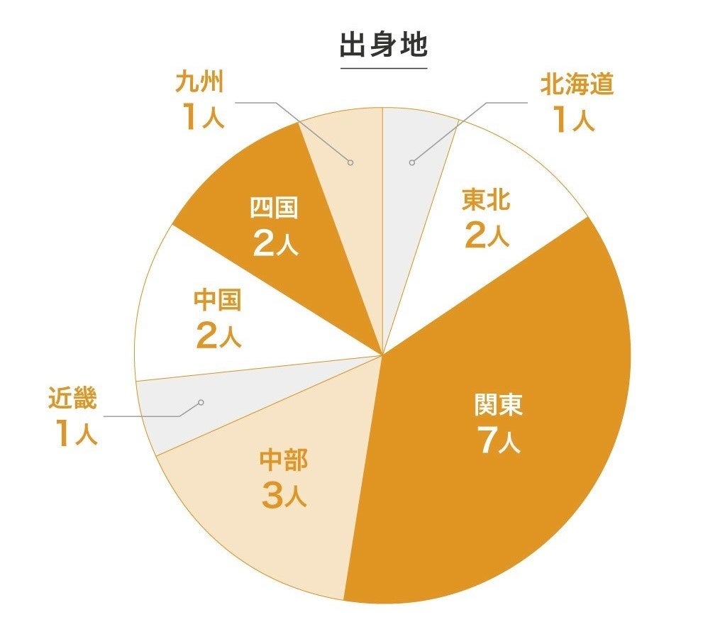 なお、新入社員19名を出身地別にみると95%が東京都以外で、北は北海道から南は長崎まで、日本全国から幅広く集まっています。