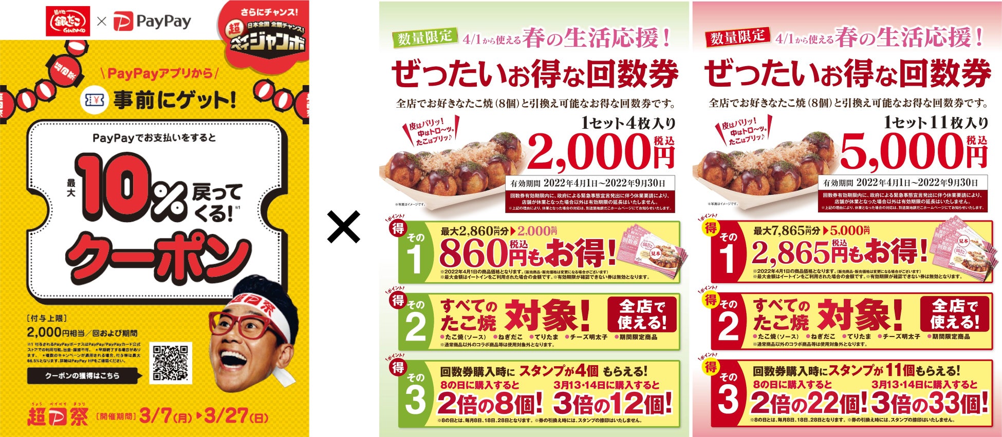 ただでさえ、“ぜったいお得な” 『春の回数券』 を、「PayPayクーポン」の利用で最大10%のPayPayボーナスが戻り、さらに開催中の大創業祭(スタンプ2倍・3倍の)期間中に購入すれば、あっという間にスタンプも貯まり、カードのランクアップやたこ焼も無料でもらえるビッグチャンス!!お得過ぎる~!!!