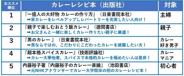 【夏休みにカレー大學推奨「カレーレシピ本ベスト5冊」を発表!】夏は夏バテ予防に、キャンプに、カレーを作る機会が増加!カレーのプロのおススメのレシピ本の調査結果を発表します。話題の「新欧風カレー」も!