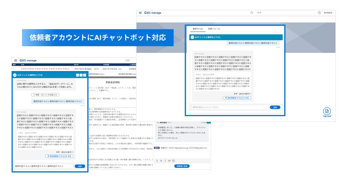 GVA TECH株式会社(本社:東京都渋谷区、代表取締役:山本 俊、以下GVA TECH)は、法務データ基盤システム「GVA manage(ジーヴァ マネージ)」において、事業部向けに契約書関係や法律相談をサポートするAIチャットボット機能をリリースしたことをお知らせいたします。