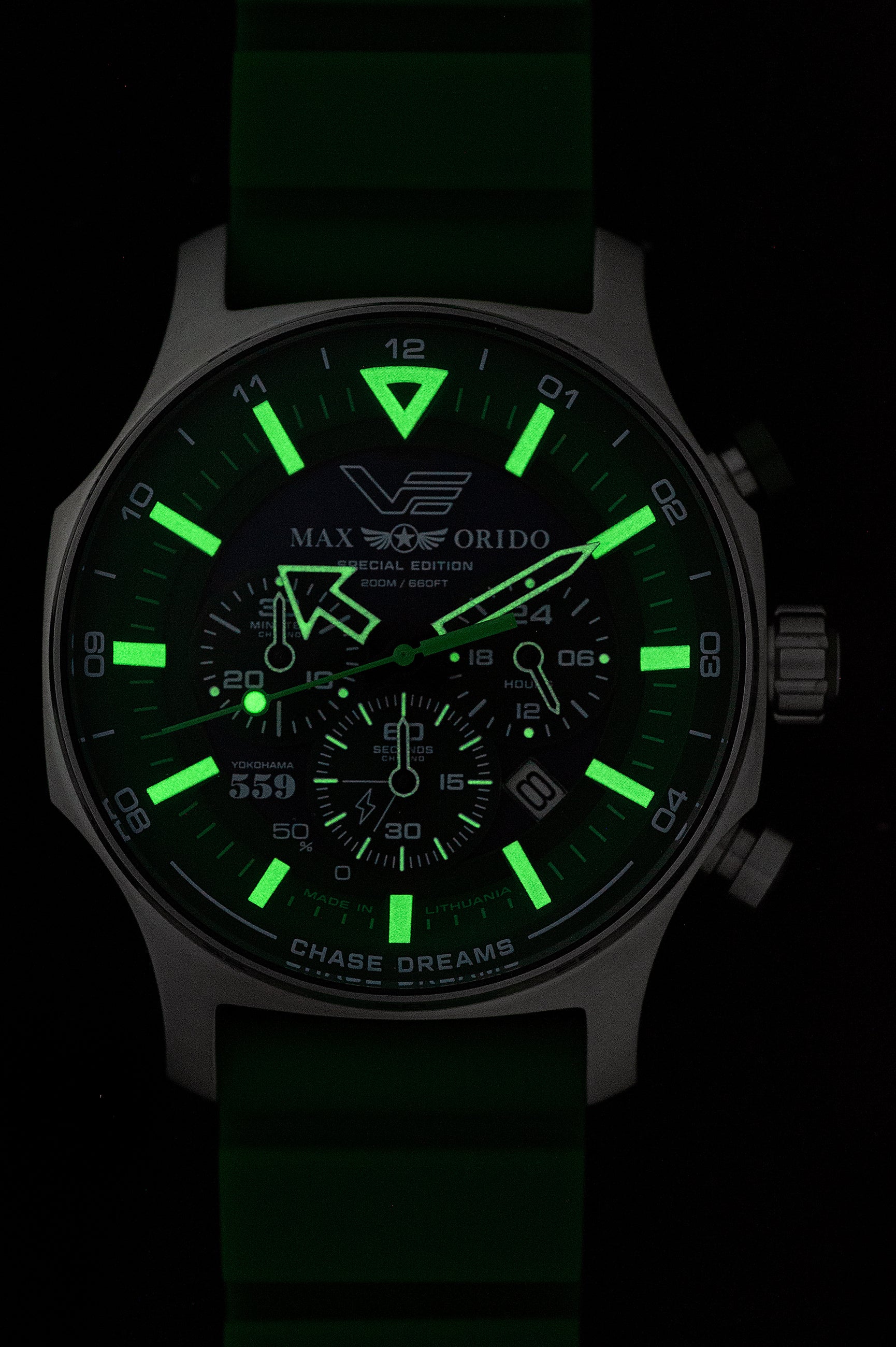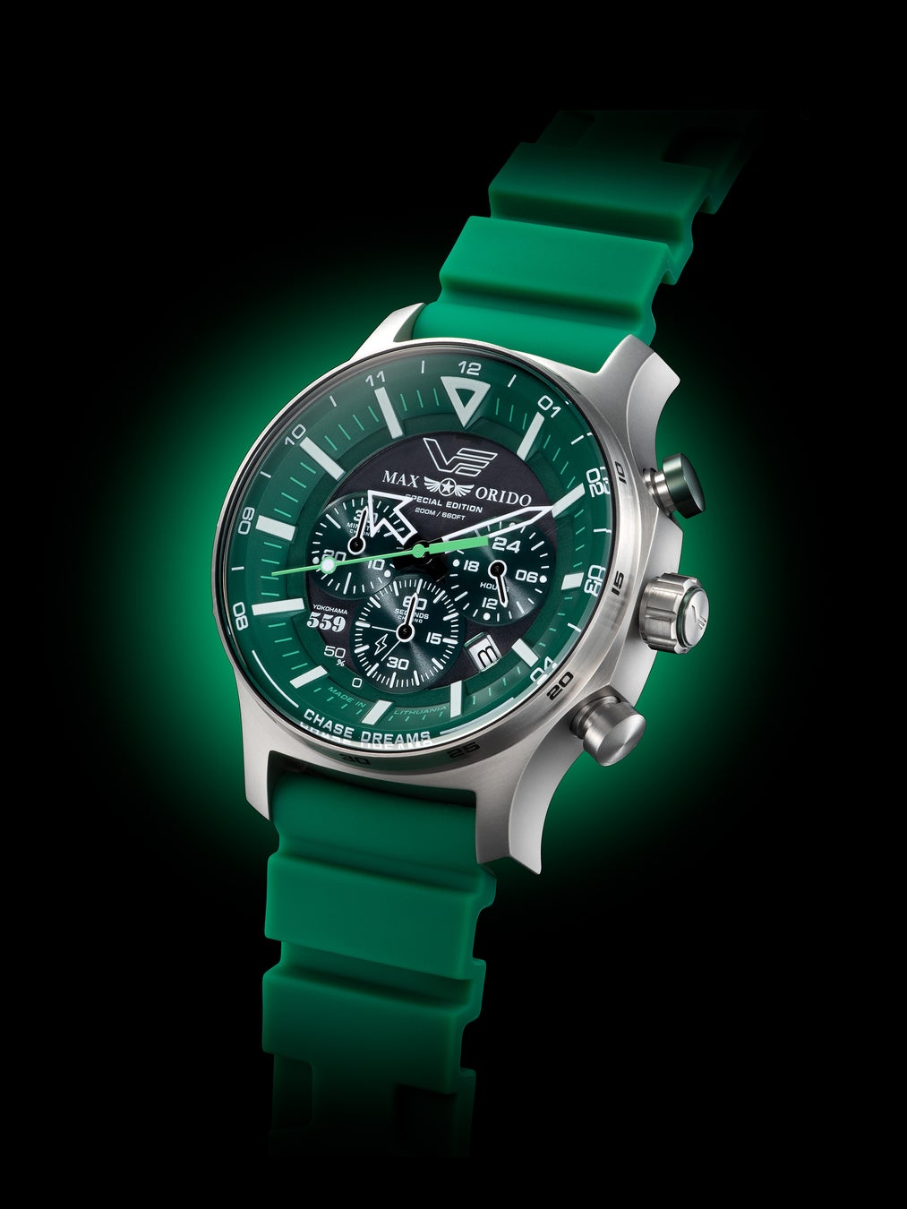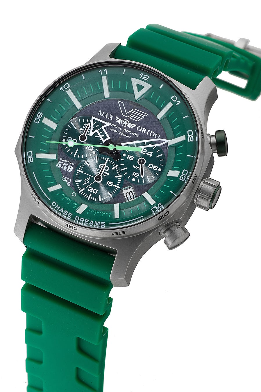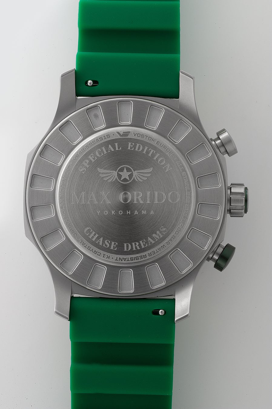 本モデルは、織戸選手の象徴カラーであるグリーンを基調にデザインされた特別仕様。VOSTOK EUROPEの人気ソーラーモデルをベースに、タフネスと実用性を追求したソーラーパワー・クロノグラフとして仕上げられています。