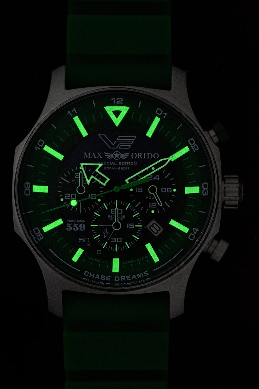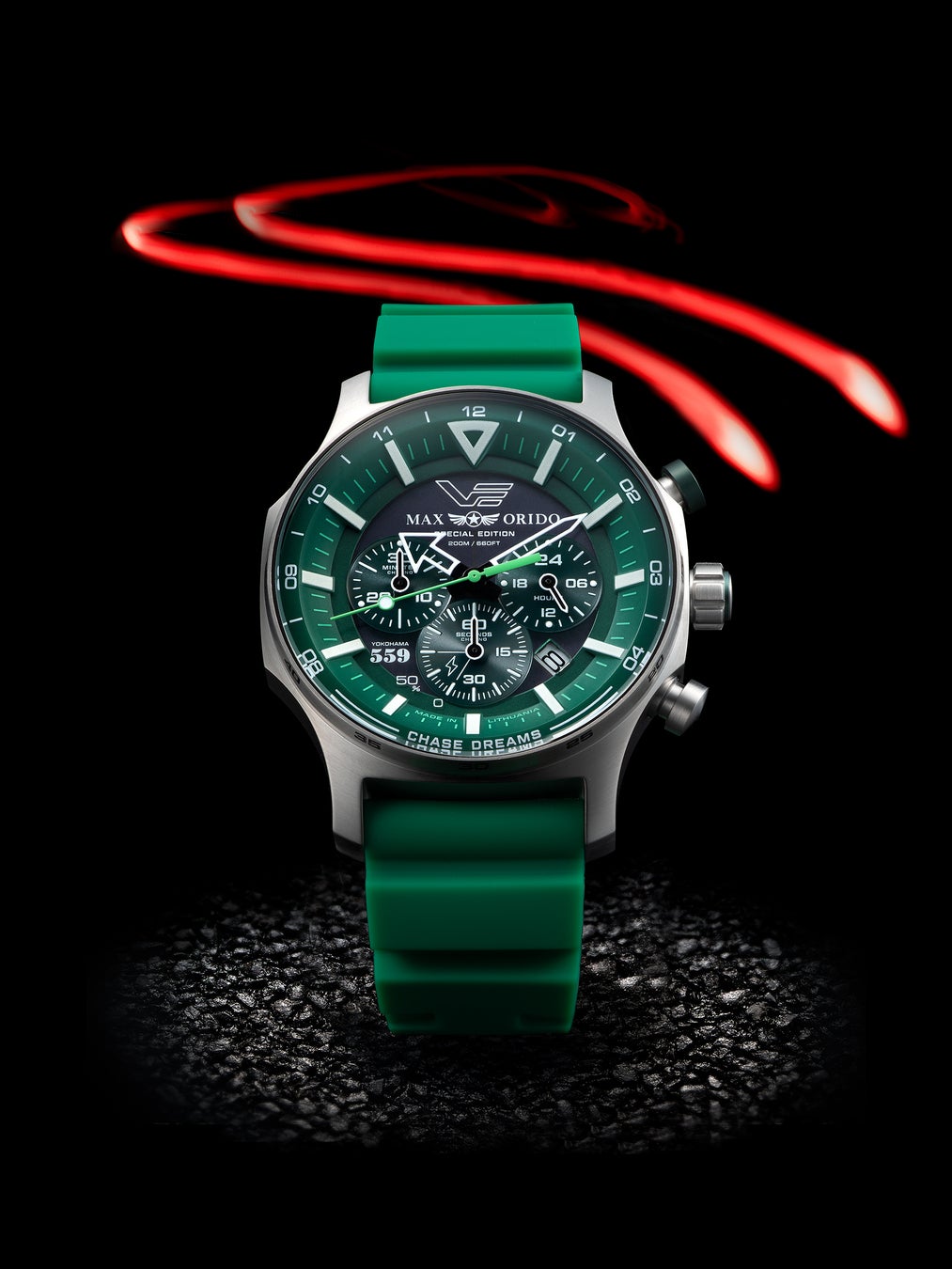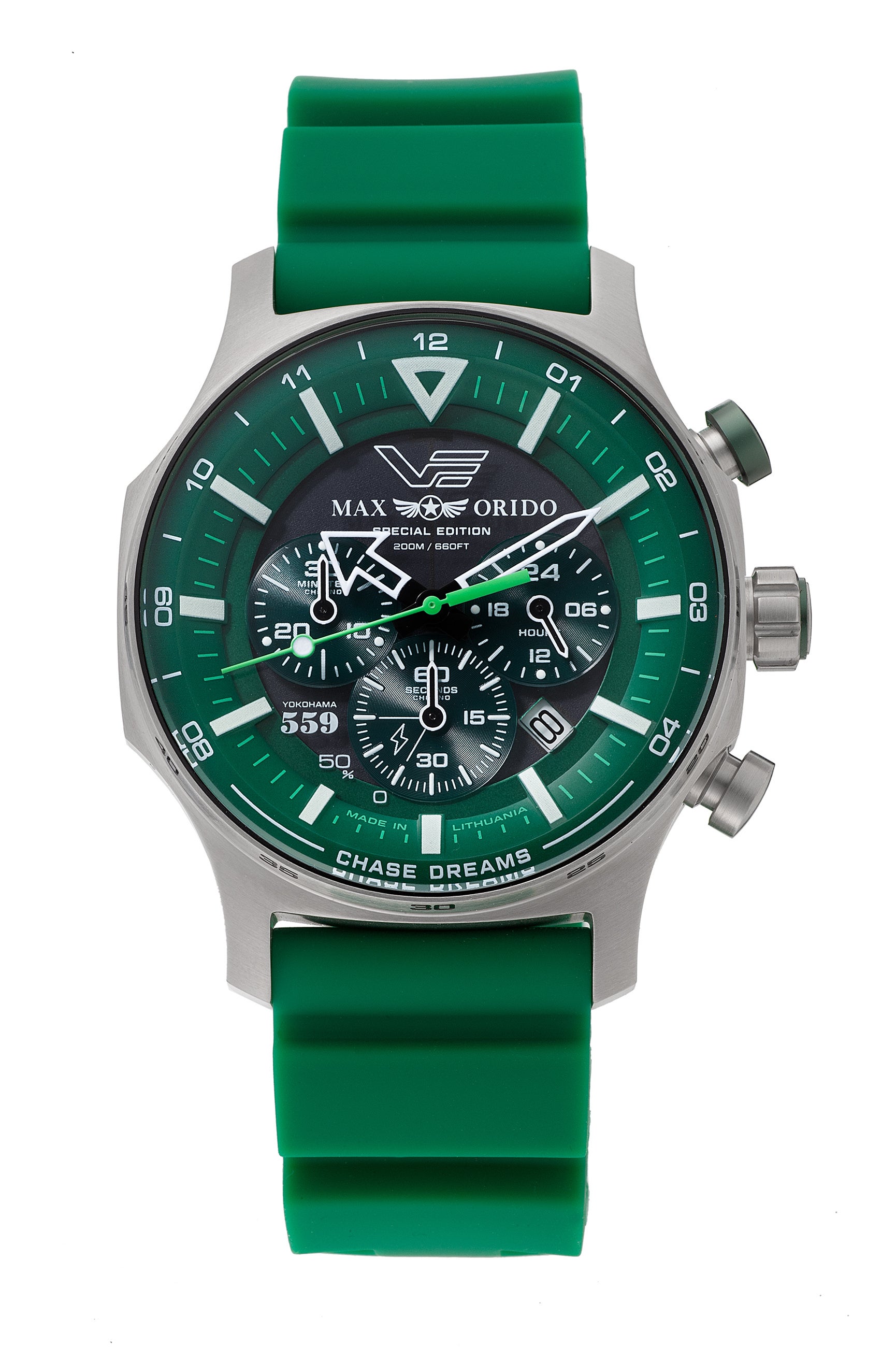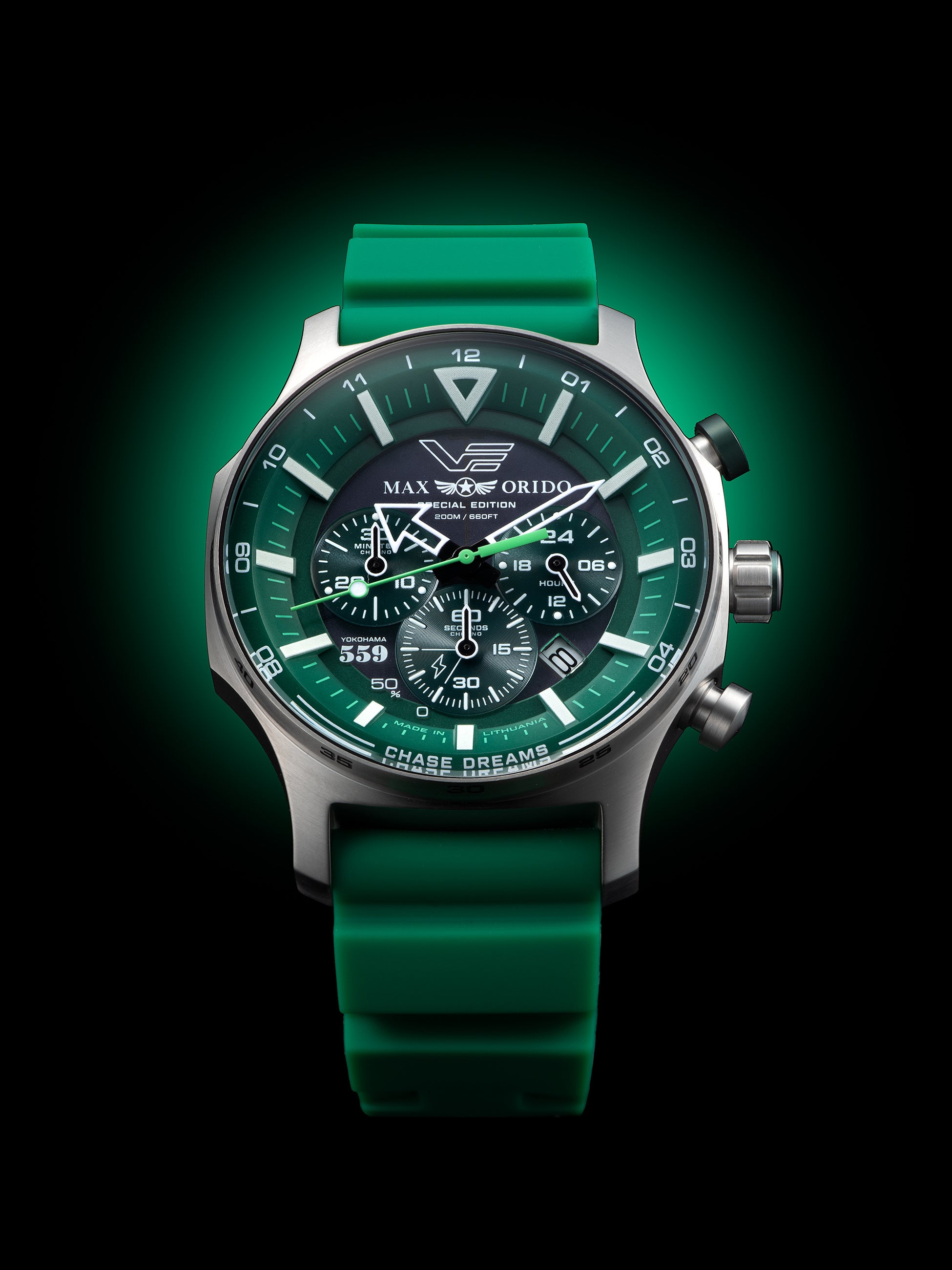 本モデルは、織戸選手の象徴カラーであるグリーンを基調にデザインされた特別仕様。VOSTOK EUROPEの人気ソーラーモデルをベースに、タフネスと実用性を追求したソーラーパワー・クロノグラフとして仕上げられています。