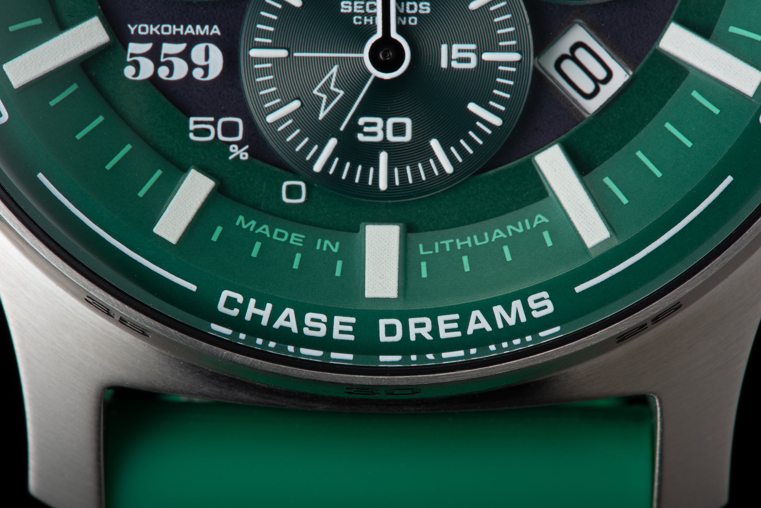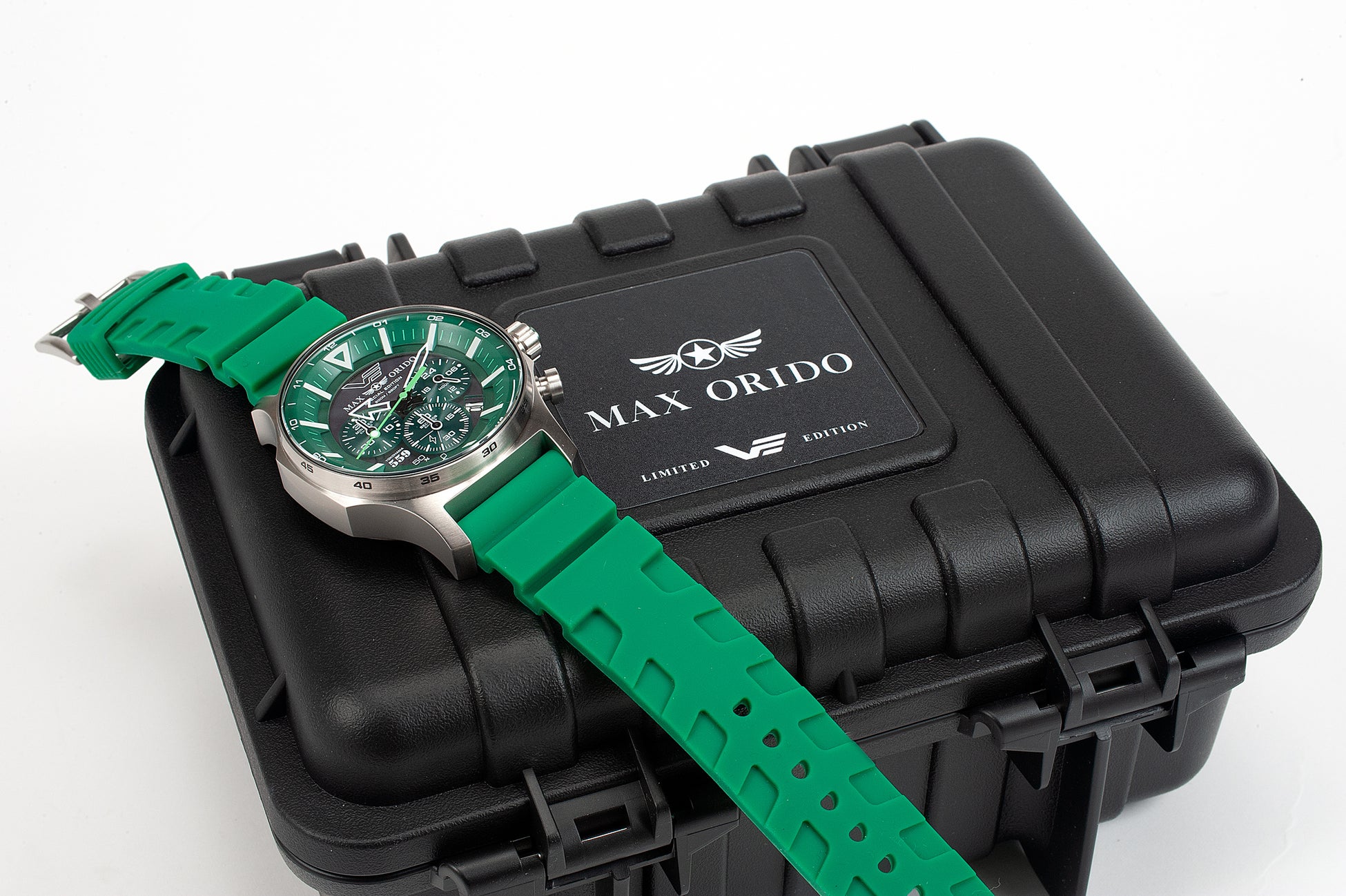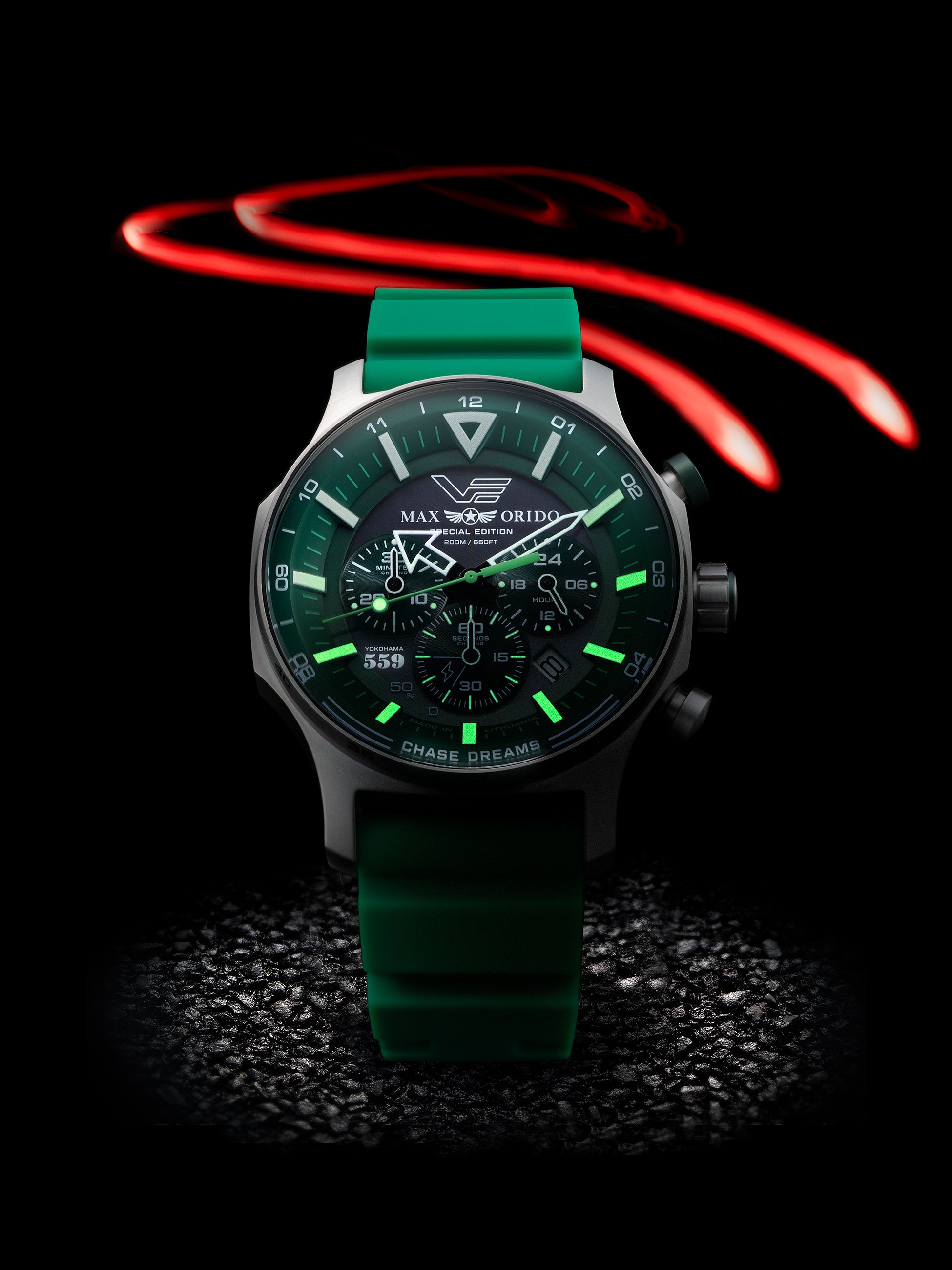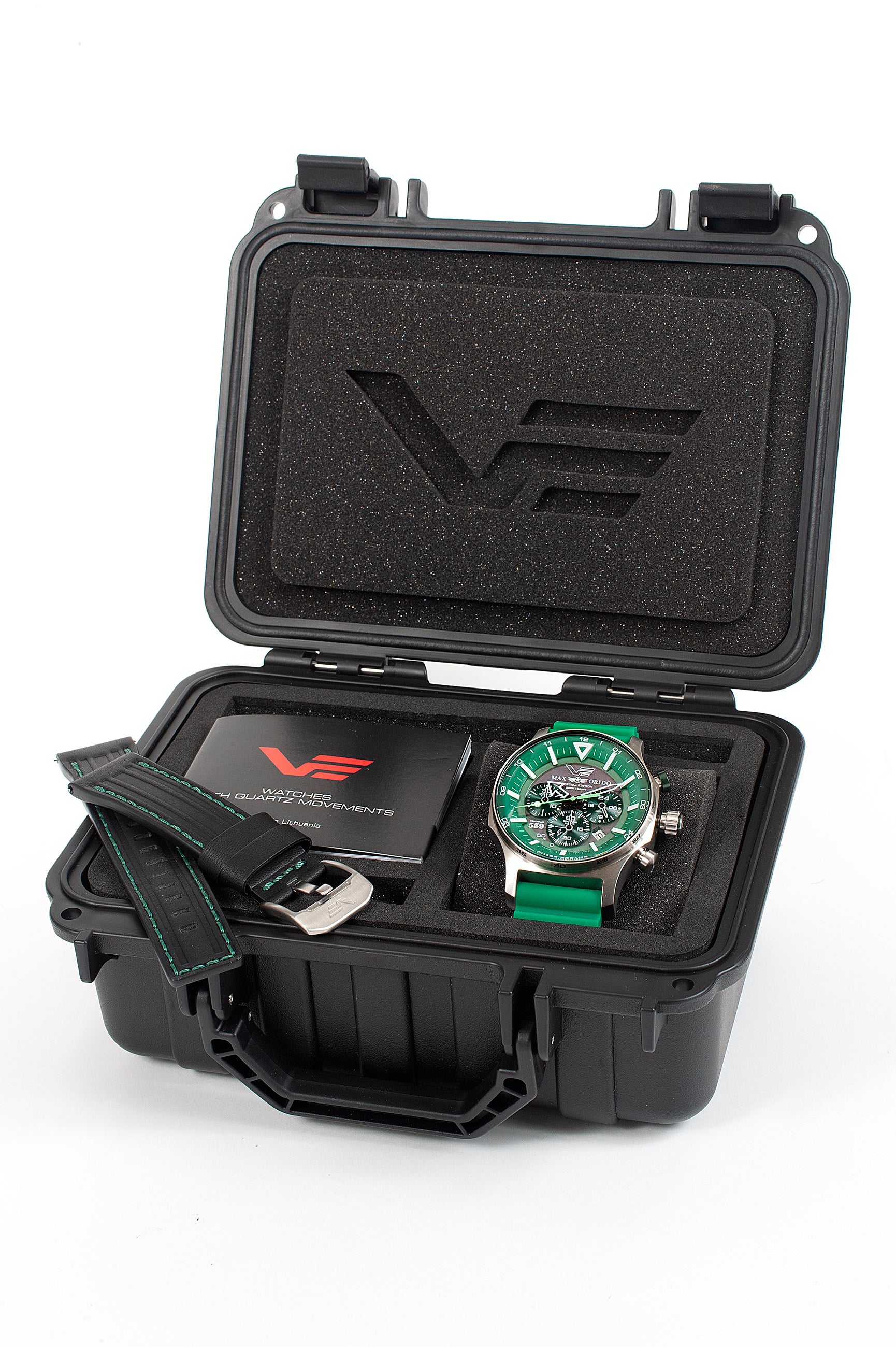 本モデルは、織戸選手の象徴カラーであるグリーンを基調にデザインされた特別仕様。VOSTOK EUROPEの人気ソーラーモデルをベースに、タフネスと実用性を追求したソーラーパワー・クロノグラフとして仕上げられています。