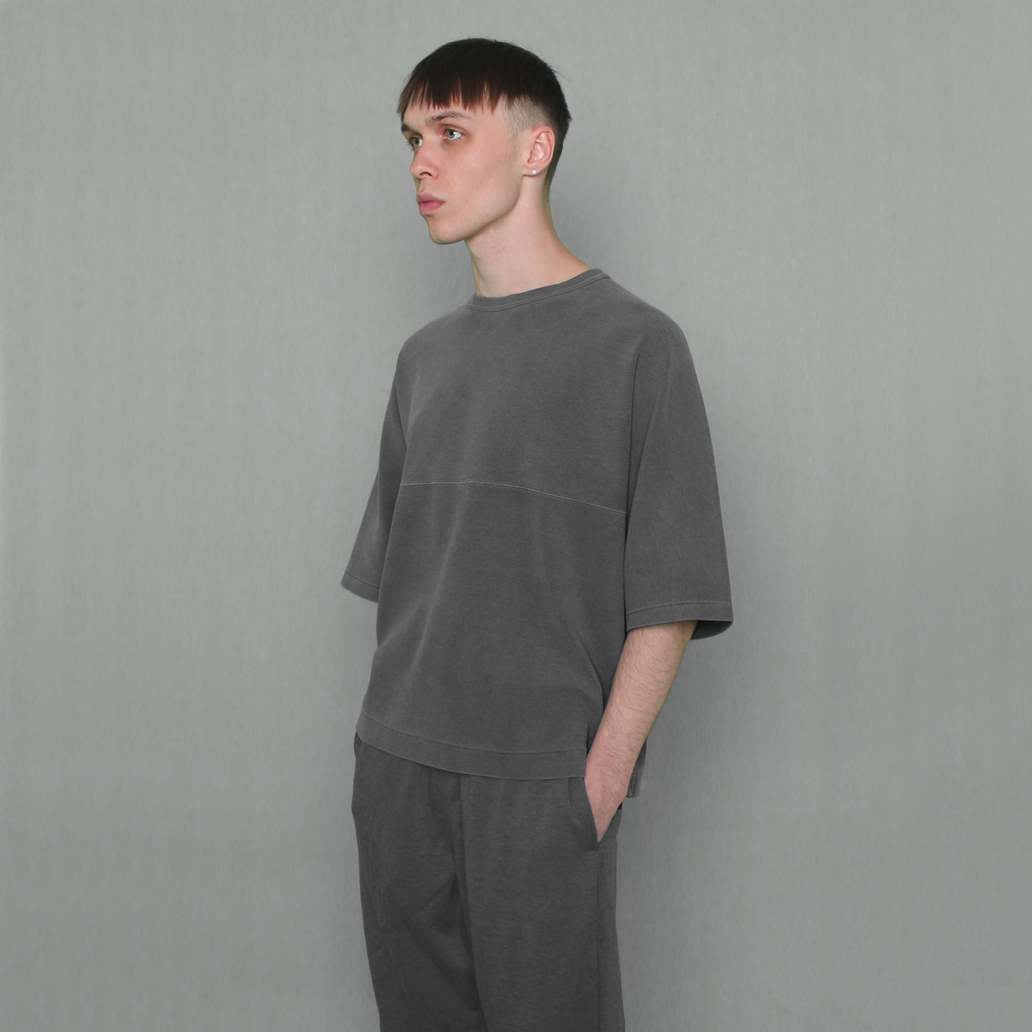 特徴: ソフトで肉厚なループをかなり短めにカットしたパイル素材を使用したドルマンTシャツ。