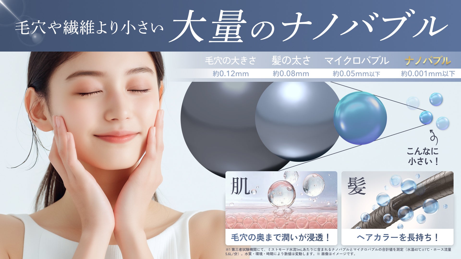紫外線や冷房で乾燥しがちな髪や肌を、毛穴より小さなナノバブルがやさしく洗浄し、うるおいと温もりを届けてくれます。しっとり艶やかな美しさを取り戻し、浴びるたびに美容液に包まれるような美肌シャワー体験を提供します。さらに、男性が抱えがちな髪のボリューム、頭皮のかゆみ・べたつきなどのトラブルも、ナノバブルが毛穴の奥まで浸透することでケアすることができます。