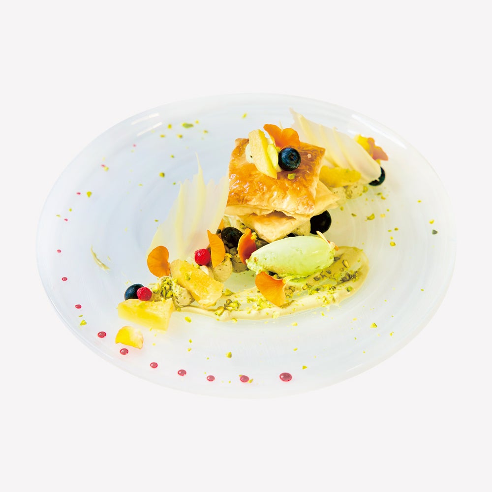 香ばしく焼き上げたパイ生地に、ピスタチオとホワイトチョコのクリーム、 バターとバニラでじっくりキャラメリゼしたパイナップル、 カスタードクリームとピスタチオのアングレーズソース、ピスタチオのアイスクリームを添えて仕上げました。