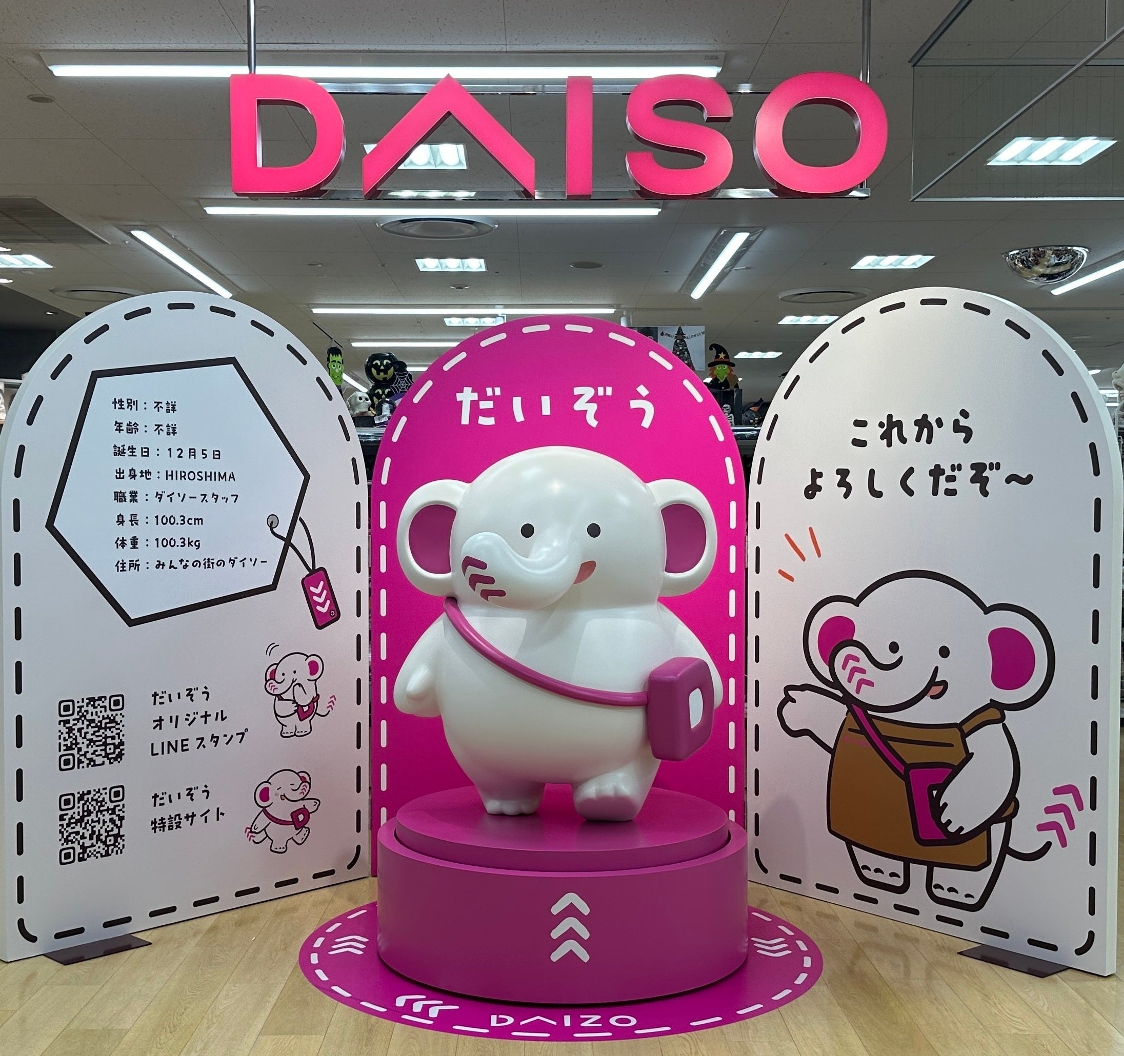 「だいぞう」は、社内の応募作品から選ばれた“象”をモチーフとしたキャラクターで、ブランドカラーのピンクをポイントに、鼻としっぽには大創産業のロゴのスリーアローズをあしらっています。お客様にお買い物の魅力やワクワクをもっと伝えることを目指し、“みんなの街のDAISOスタッフ”として、店舗やSNSを通して「だいぞう」の活躍が始まります。