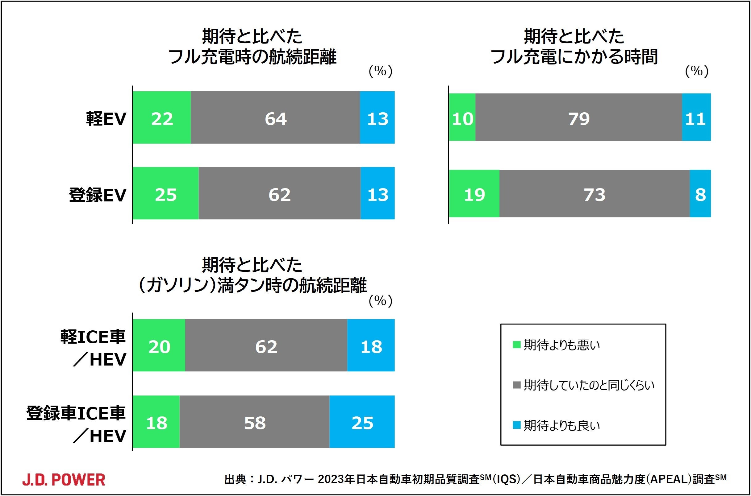 軽EVのフル充電時の航続距離について「期待より悪い」とする割合は22%でした。これは、バッテリー容量が軽EVより大きい登録EVと同等、もしくは登録EVよりもよい評価です。