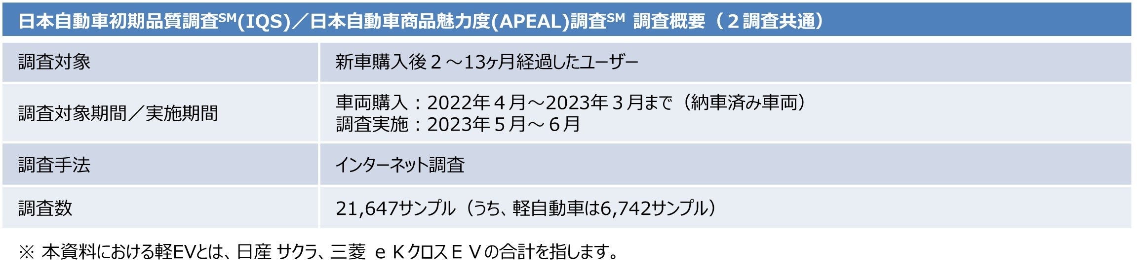 顧客満足度(CS)調査や消費者動向に関するリサーチ・コンサルティング会社であるJ.D. パワージャパン(本社:東京都港区、代表取締役社長:山本浩二、略称:J.D. パワー)では、年1回、新車購入者による車両評価調査、「日本自動車初期品質調査℠(IQS)」、「日本自動車商品魅力度(APEAL)調査℠」を実施しています。2023年調査は5月から6月に実施し、2万を超える新車ユーザーの声を分析しています。
