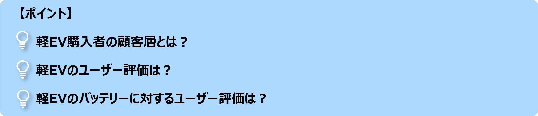 本ニュースレターでは、この2つの調査データから、好調に販売台数が推移する軽EV(電気自動車)について、 ユーザープロファイルや車両評価の一部を整理し、日本におけるEV普及の現状と課題を解説しています。