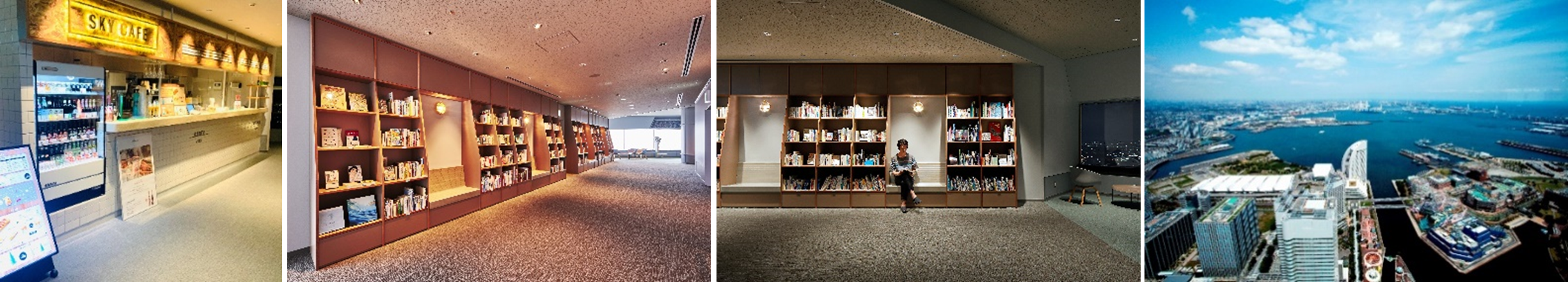 スカイカフェ/横浜・空の図書室(昼)/横浜・空の図書室(夜) ※撮影:Takuya Furusue /スカイガーデンからの眺望