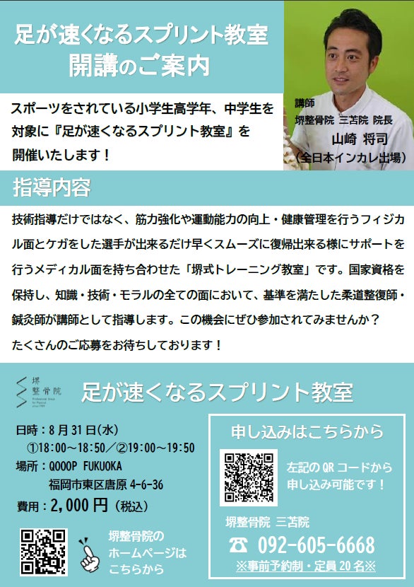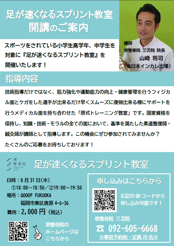 2022年8月31日(水)に、福岡市東区にあるQOOOP FUKUOKAにて堺整骨院グループが「堺式 足が速くなるスプリント教室」を開講致します。