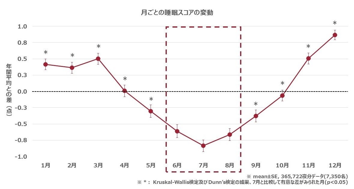夏季の中でも7月が最も睡眠スコアが低下し、最も睡眠スコアが高い12月と比較すると約1.7点の差があり、夏季は睡眠スコアが有意に低下していました。