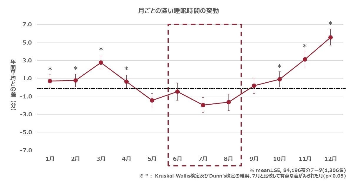 夏季は睡眠時間内の深い睡眠の時間が短く、最も短い7月は最長の12月と比較して約7.5分も有意に短く、さらに寝始めてから深い睡眠に到達するまでの時間の遅延も見られました。