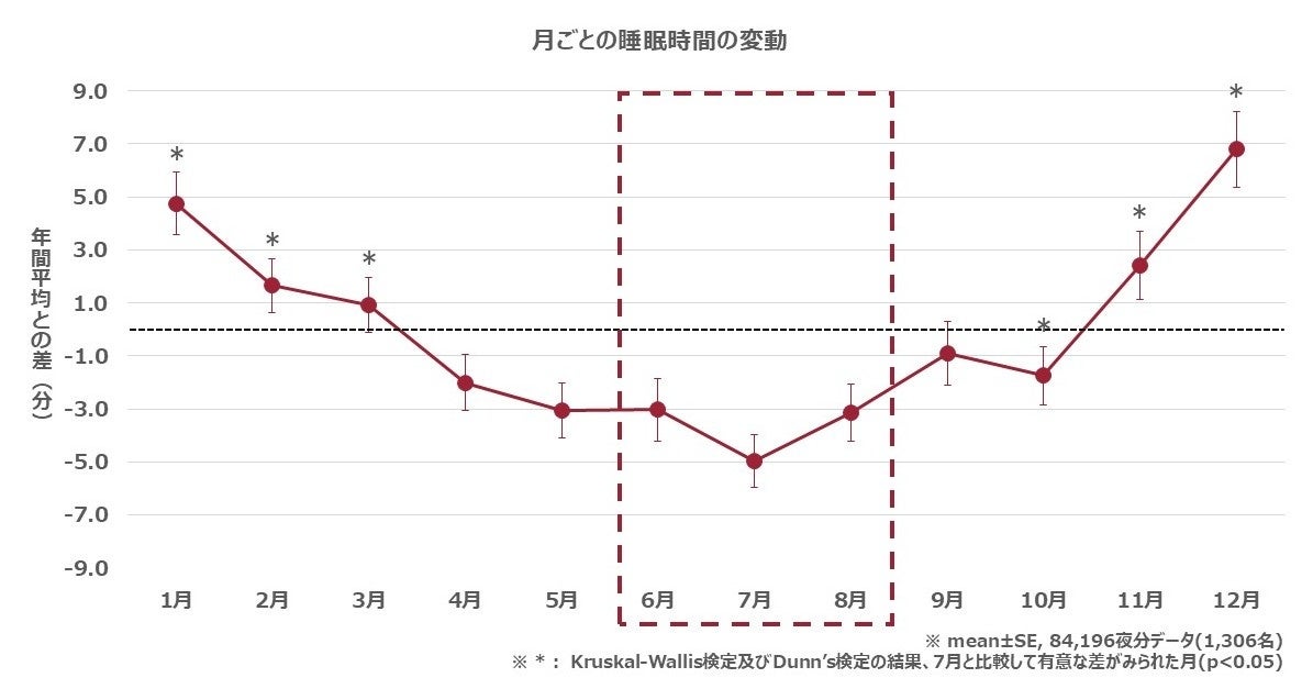 夏季は睡眠時間が短く、最も短い7月は最長の12月と比較して約12分も有意に短いという結果でした。