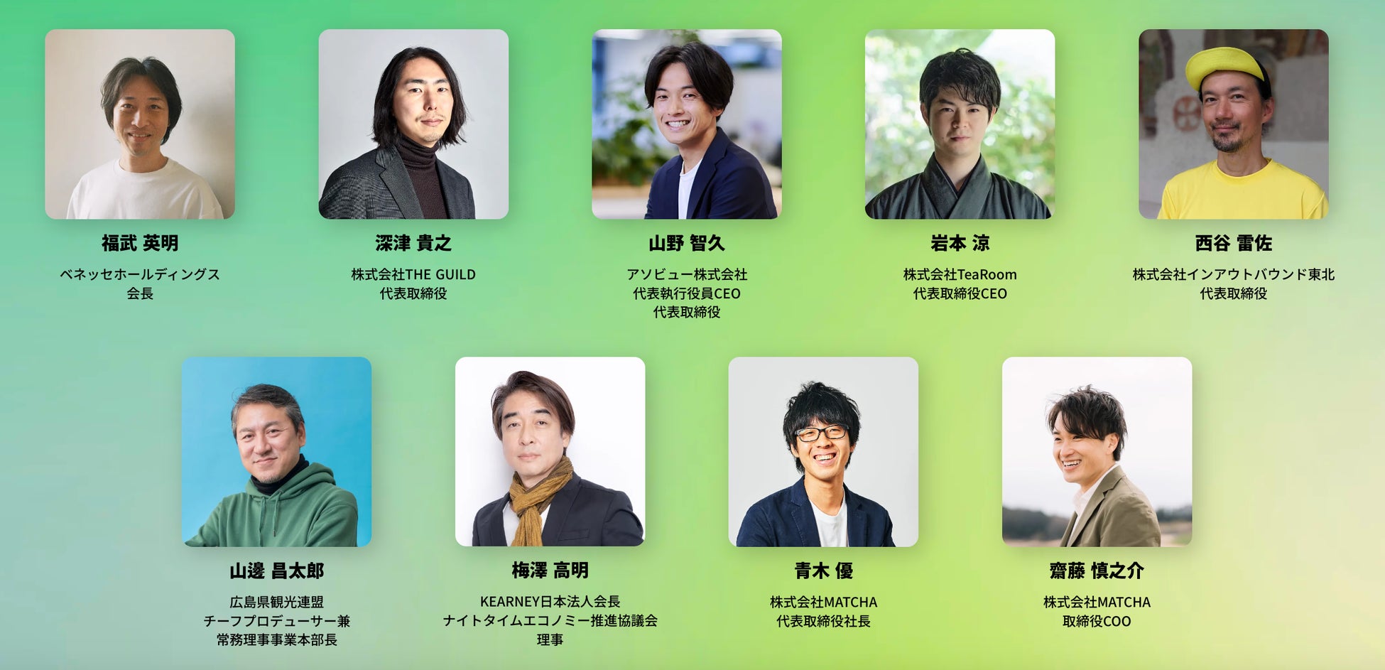 今年も多様な登壇者が決定!ベネッセホールディングス福武氏、アソビュー山野氏、広島県観光連盟山邊氏、TeaRoom岩本氏、KARNEY日本法人梅澤氏、インアウトバウンド東北西谷氏、THEGUILD深津氏