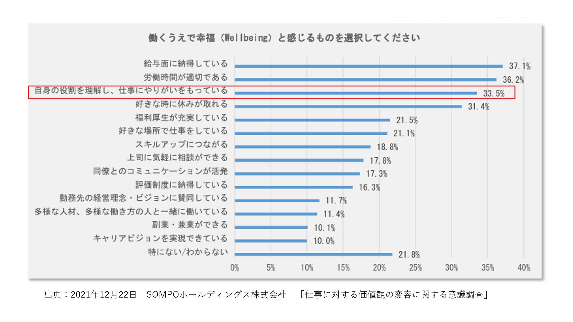 コロナ禍を経て、社員が働くうえでの幸福感の要素についての調査では、福利厚生や休暇を抑えて「役割理解・やりがい」という内面的な要素が3位にランクインしました。