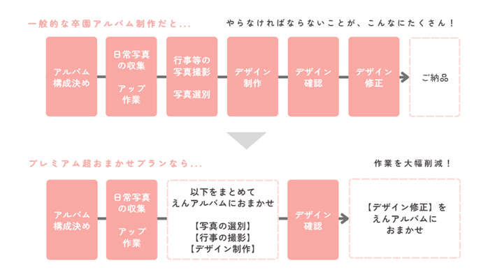 デザイン制作は、デザインを決めるだけでなく、幾つかのタイミングで関係者への確認作業が生じるため、納品までに手間のかかる作業とされてきました。「プレミアム超おまかせプラン」では、デザインの制作から「えんアルバム」側で行うため、制作者の確認工数を大幅に削減し、負担を軽減します。