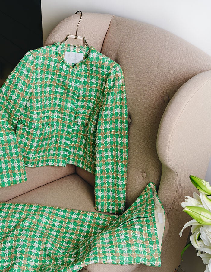 Model:GRASS ・Jacket ¥66,000・Skirt ¥39,600(共に税込)/Ballsey